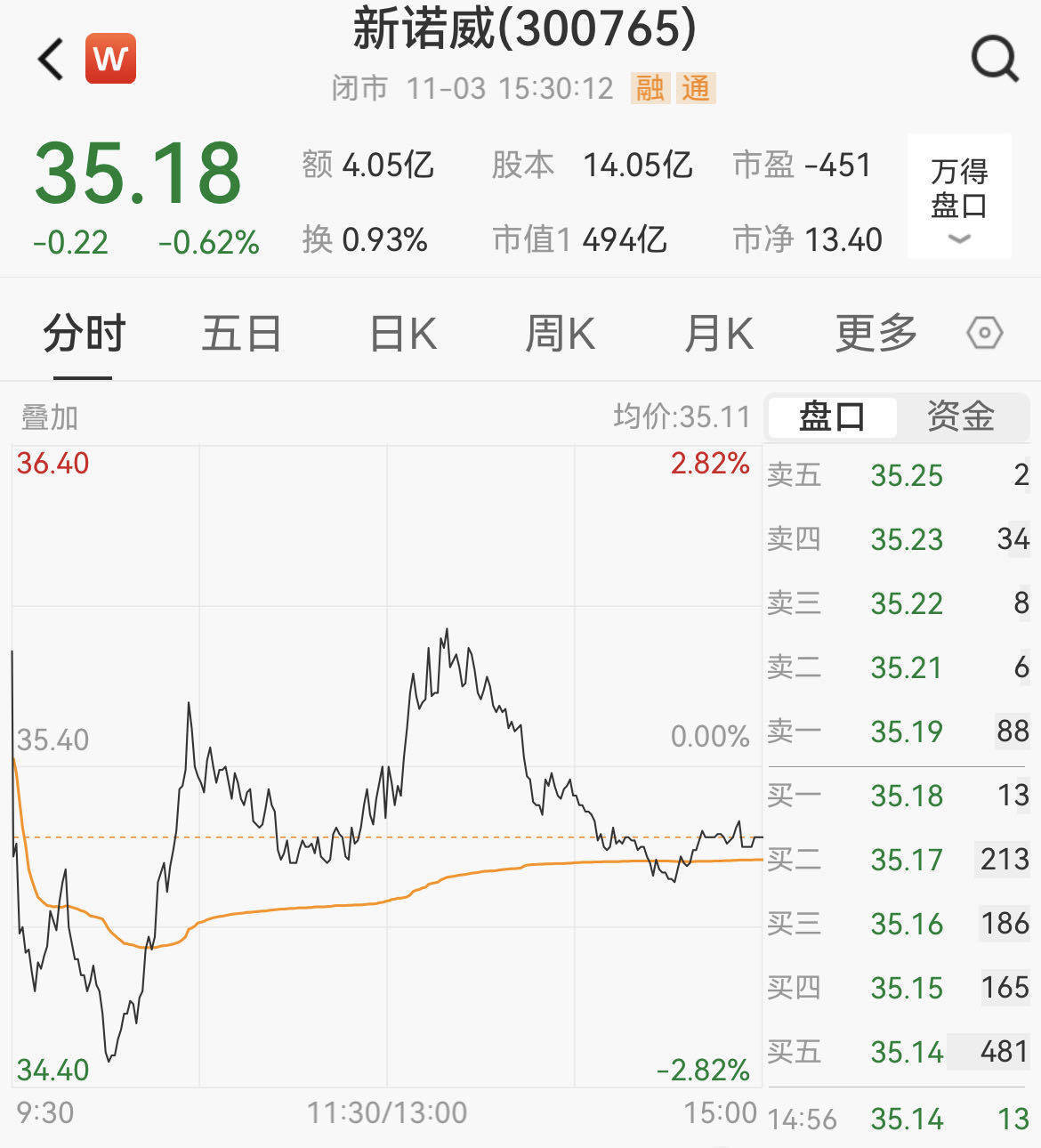 二级市场方面,11月3日,新诺威股价高开低走,盘中最大跌幅2.82%,收盘跌0.62%,报35.18元/股,总市值494亿元。