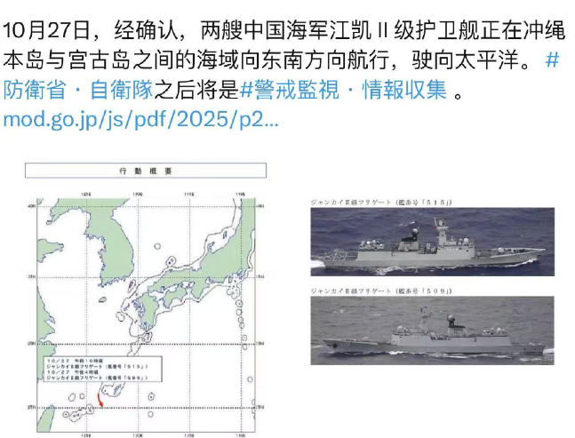 10月27日,当美国代表团抵达日本进行访问之际,两艘中国海军江凯Ⅱ级护卫舰出现在琉球岛本岛与宫古岛之间的海域,正向东南方向航行,驶向广阔的太平洋。这一时间点的巧合引发外界的高度关注,台媒立刻认为此举是在向美方发出明确信号。 日本防卫省统合幕僚监部的监测资料显示,两艘江凯Ⅱ级护卫舰近日在宫古岛东北方海域被发现。可问题是,这不是中方军舰首次穿越宫古海峡。自2013年5月以来,我海军远海训练编队多次穿过宫古海峡,从近海训练走向西太平洋。宫古海峡是位于西太平洋的重要国际水道,连接东海与菲律宾海,战略地位显著。宫古海峡平均宽度约239公里,中部有约195公里宽的国际航道。这里是中国海空军穿越第一岛链进入深海的重要地带,也是中国船只前往南太平洋到澳大利亚等国,或横穿太平洋到中美洲、南美洲等地的经济航线。至于此举是啥信号?也许是在警告贝森特一行,不要指望着日本充当炮灰,中方完全有实力有决心把一切置于掌控之中吧。